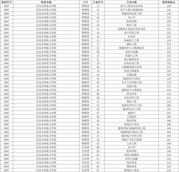 河北水利电力学院历史类投档分数线最高542分,最低519分,物理类投档分数线最高546分,最低500分。