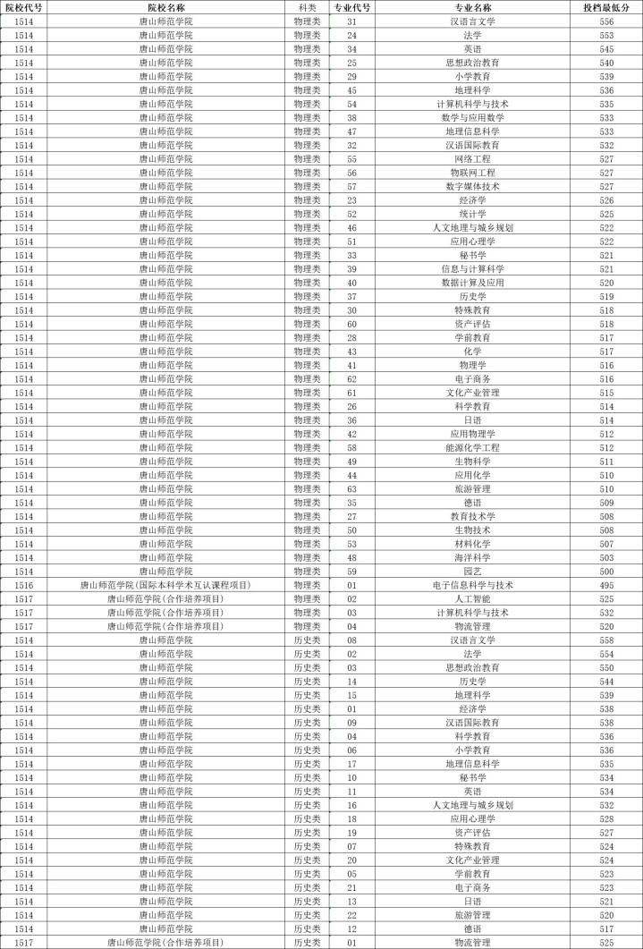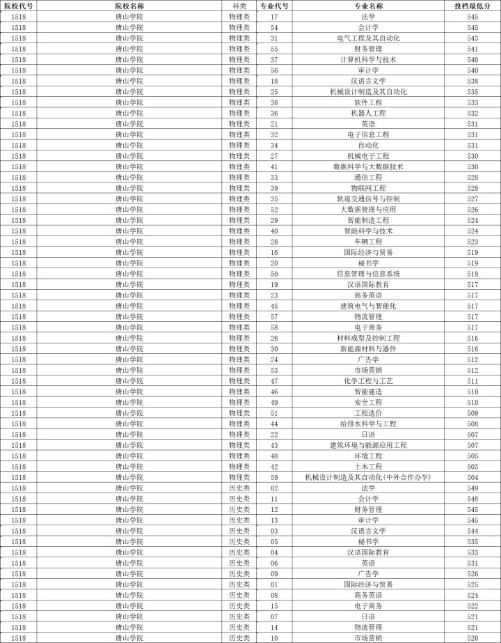 唐山学院历史类投档分数线最高549分,最低520分,物理类投档分数线最高545分,最低503分。