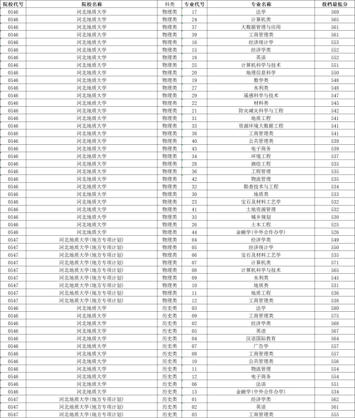 河北地质大学历史类投档分数线最高580分,最低551分,物理类投档分数线最高569分,最低525分。
