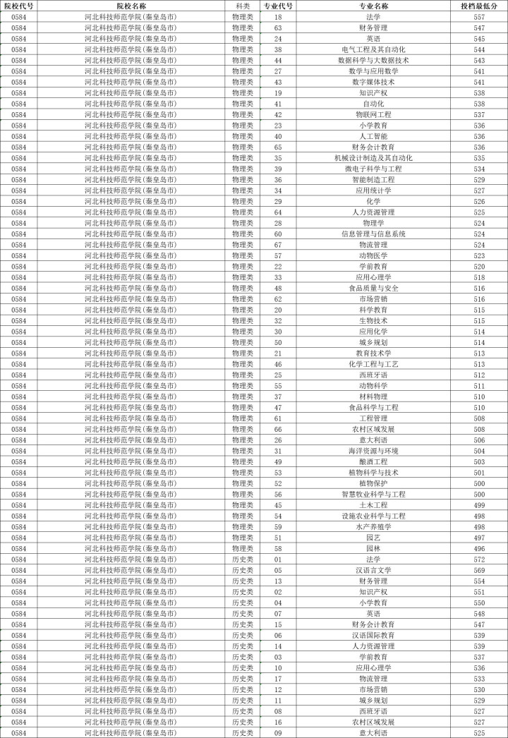 河北科技师范学院历史类投档分数线最高572分,最低525分,物理类投档分数线最高557分,最低496分。