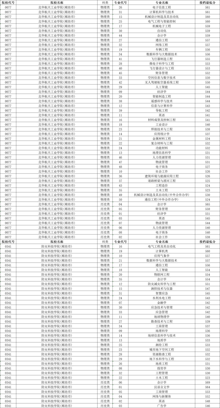 北华航天工业学院历史类投档分数线最高565分,最低538分,物理类投档分数线最高561分,最低523分。