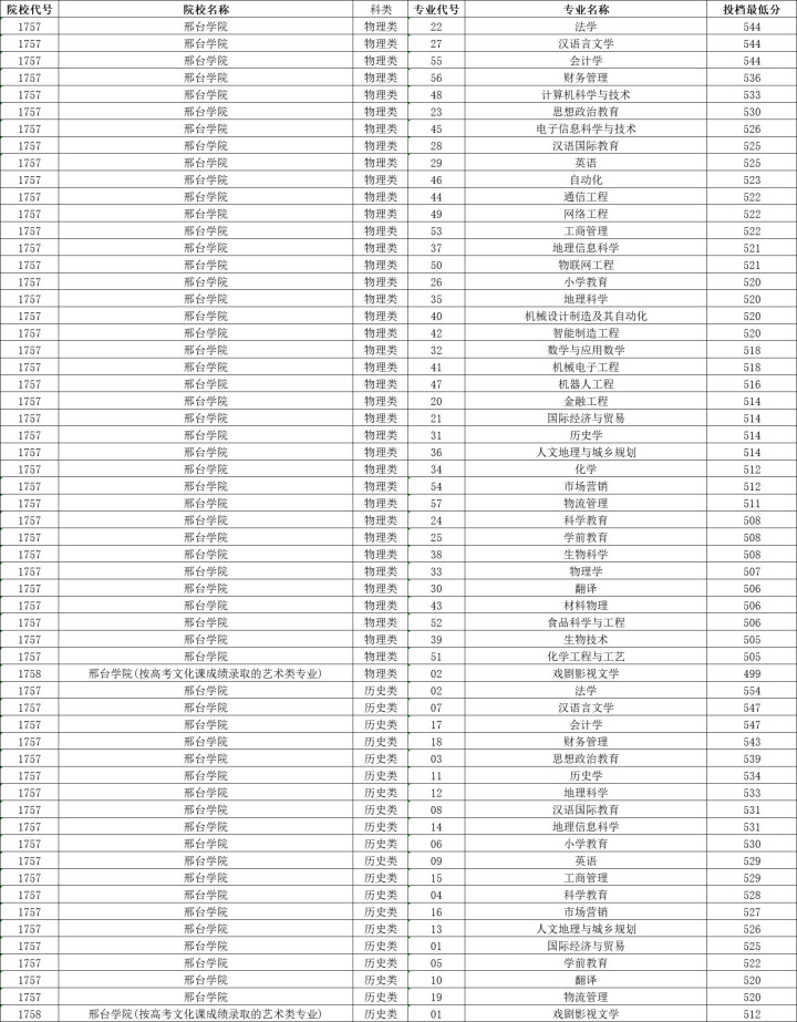 邢台学院历史类投档分数线最高544分,最低512分,物理类投档分数线最高544分,最低499分。