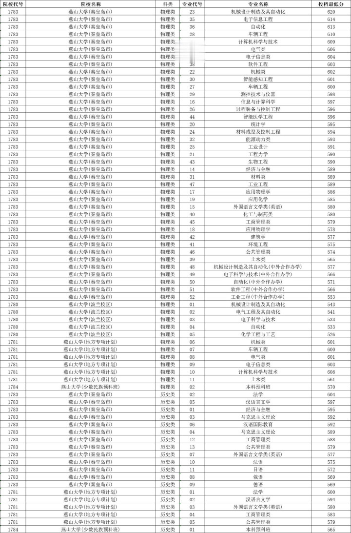 燕山大学:机械设计制造及其自动化620分、电子信息工程614分、自动化613分、车辆工程610分、计算机科学与技术609分、电气类606分、电子信息类604分、软件工程603分、机械类602分、智能感知工程601分、车辆工程600分、