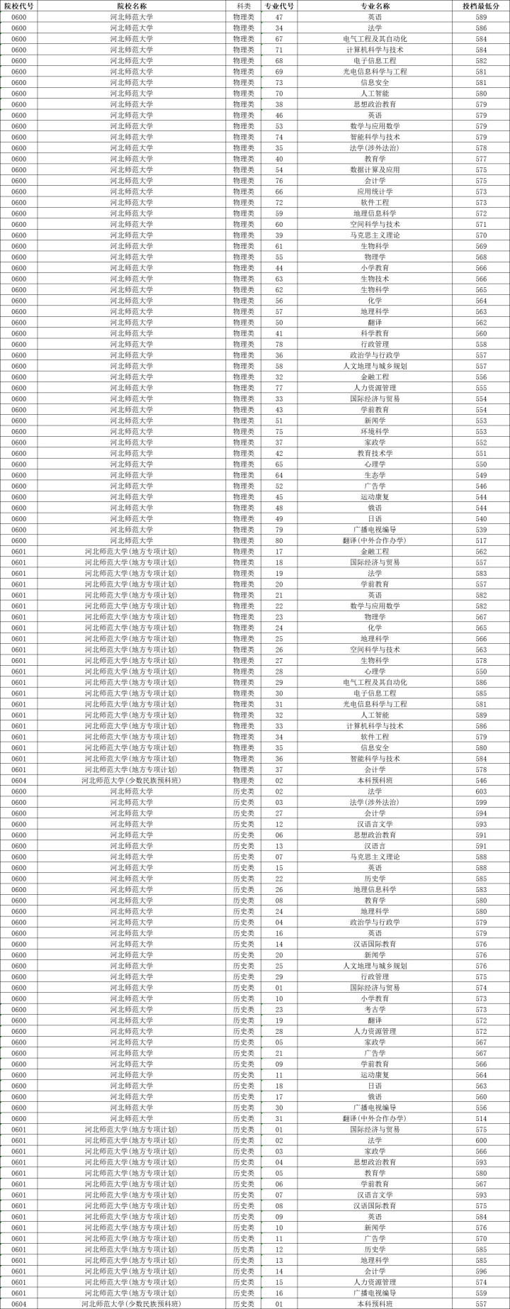 河北师范大学历史类投档分数线最高603分,最低556分,物理类投档分数线最高589分,最低539分。