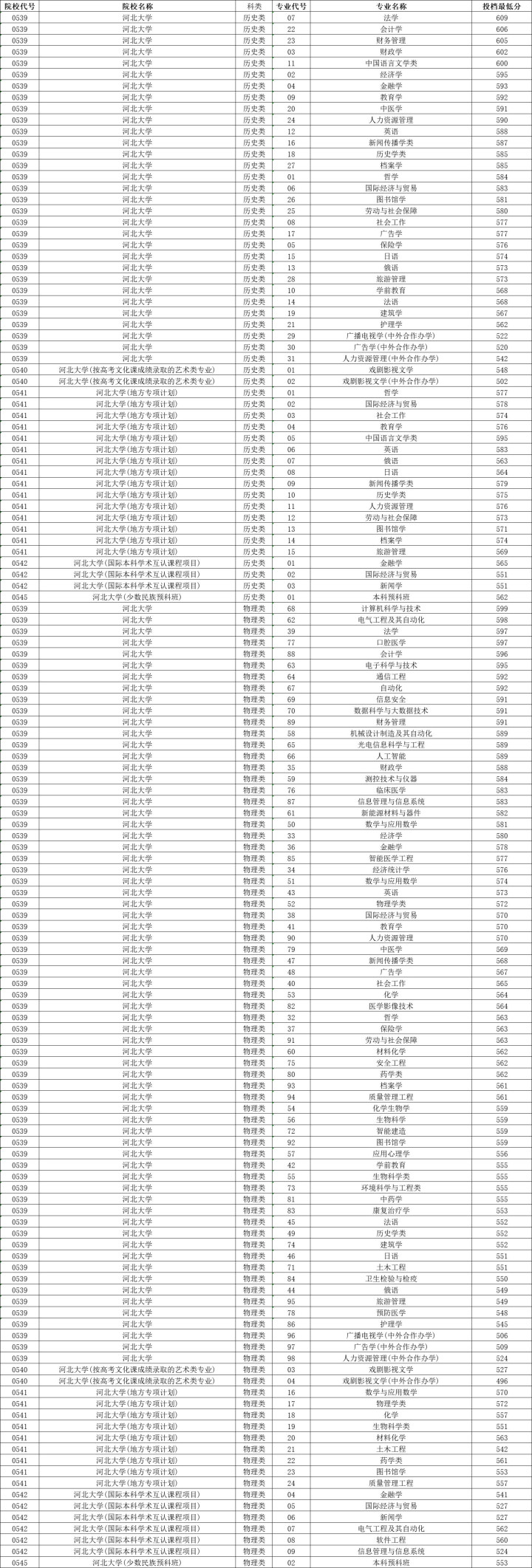 河北大学历史类投档分数线最高609分,最低562分,物理类投档分数线最高599分,最低545分。