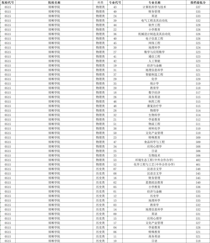 邯郸学院历史类投档分数线最高548分,最低518分,物理类投档分数线最高537分,最低506分。