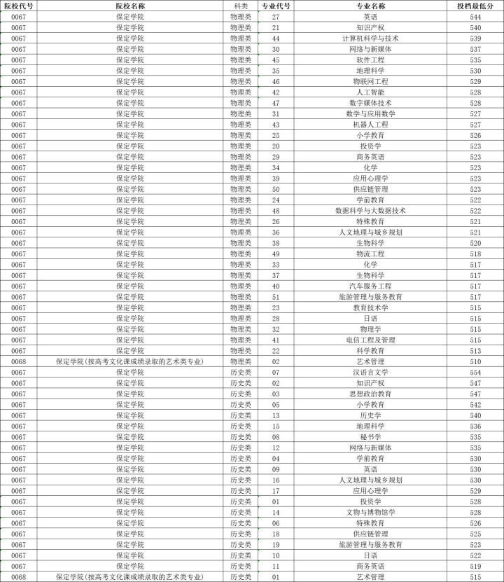 保定学院历史类投档分数线最高554分,最低515分,物理类投档分数线最高544分,最低510分。