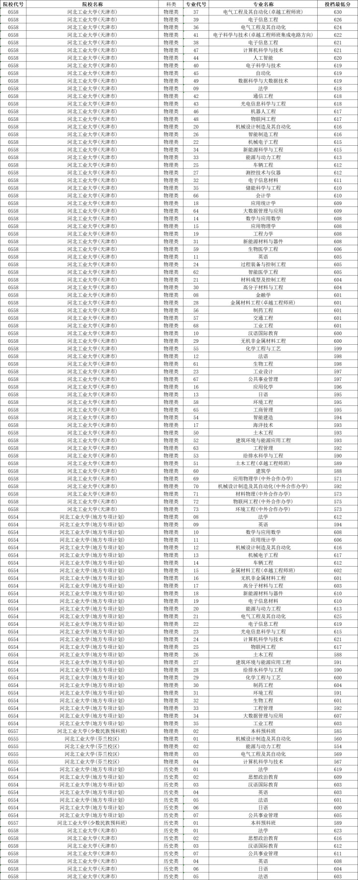 河北工业大学历史类投档分数线最高623分,最低603分,物理类投档分数线最高630分,最低588分。