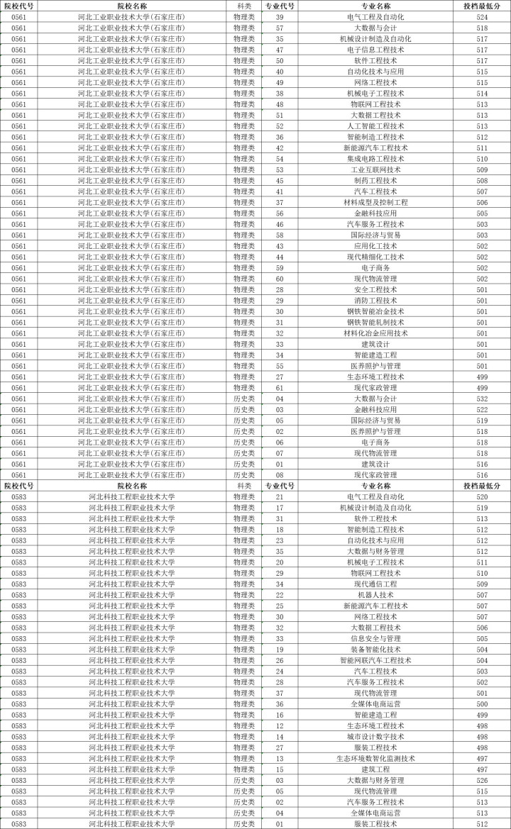 河北工业职业技术大学历史类投档分数线最高532分,最低516分,物理类投档分数线最高524分,最低499分。