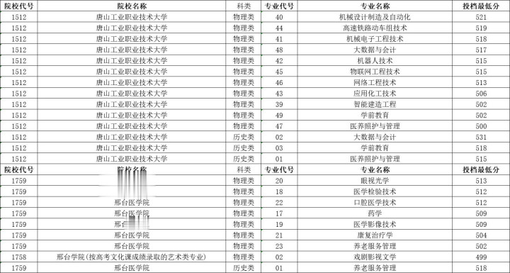 唐山工业职业技术大学历史类投档分数线最高531分,最低515分,物理类投档分数线最高521分,最低500分。