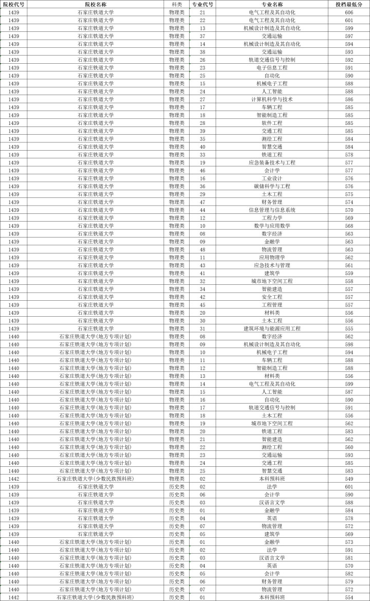 石家庄铁道大学历史类投档分数线最高601分,最低569分,物理类投档分数线最高606分,最低555分。