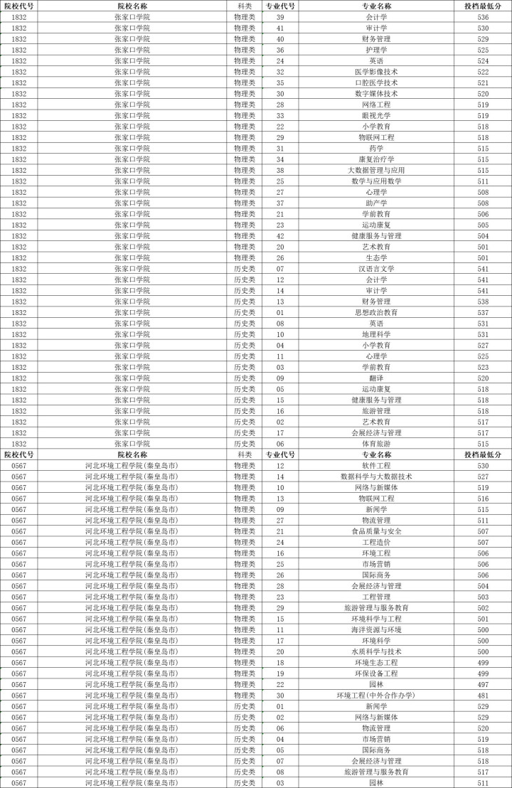 张家口学院历史类投档分数线最高541分,最低515分,物理类投档分数线最高536分,最低501分。