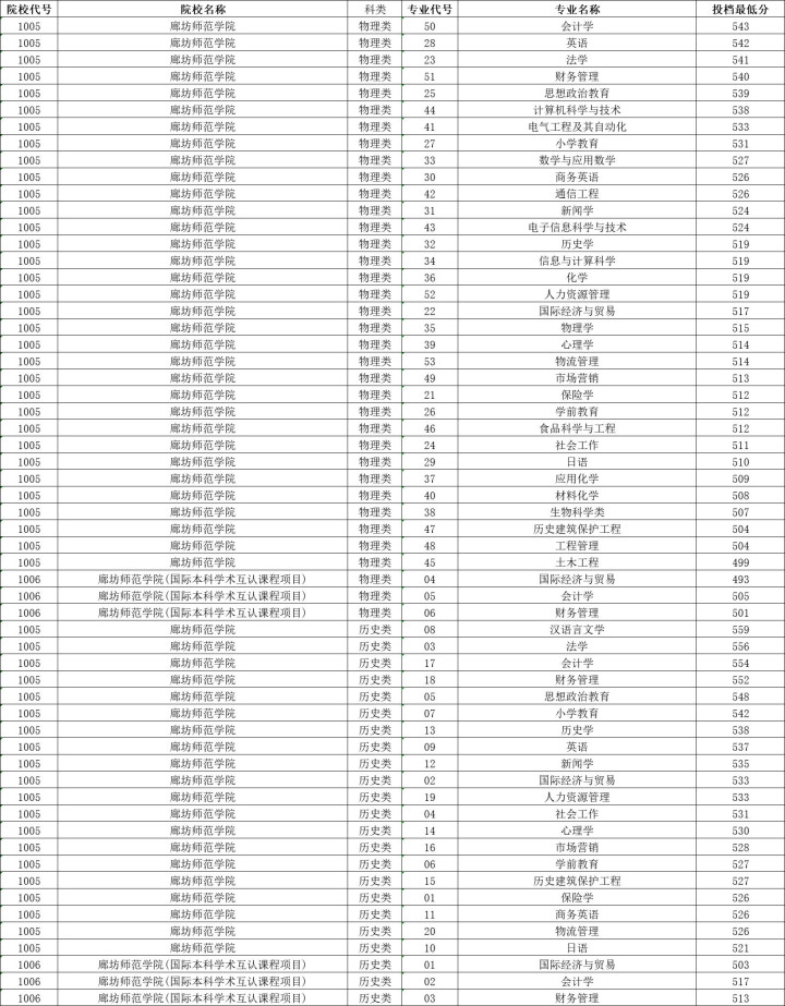 廊坊师范学院历史类投档分数线最高559分,最低521分,物理类投档分数线最高543分,最低499分。