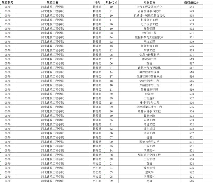 河北建筑工程学院历史类投档分数线最高528分,最低516分,物理类投档分数线最高544分,最低500分。