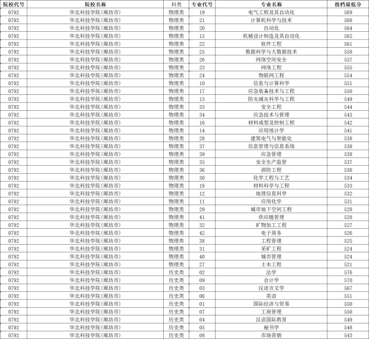华北科技学院历史类投档分数线最高576分,最低543分,物理类投档分数线最高569分,最低521分。
