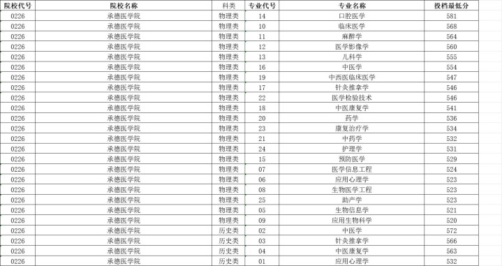 承德医学院历史类投档分数线最高572分,最低532分,物理类投档分数线最高581分,最低520分。
